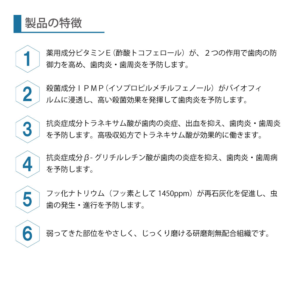 【特長】 1.薬用成分ビタミンE(酢酸トコフェロール)が、2つの作用で歯肉の防御力を高め、歯肉炎・歯周炎を予防します。